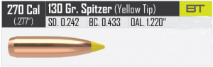 .270 Winchester 130 grain Nosler Ballistic Tip~ The .270 Winchester (or 6.8×64mm) was developed by Winchester Repeating Arms Company in 1923 and unveiled in 1925 as a chambering for their bolt-action Model 54. The cartridge is a necked down .30-03, which is the same length as the .280 Remington, both of which are longer than the .30-06 Springfield. The .270 Winchester became a very popular cartridge due to the widespread praises of gunwriters like Townsend Whelen and Jack O’Connor who used the cartridge for 40 years and touted its merits in the pages of Outdoor Life. The cartridge demonstrated high performance at the time of its introduction and was marketed as being suitable for big game shooting in the 270 to 460 metres (300 to 500 yd) range. Two additional bullet weights were soon introduced: a 6.5 grams (100 gr) hollow-point bullet for varmint shooting, and a 9.7 grams (150 gr) bullet for larger deer, elk, and moose in big-game hunting.