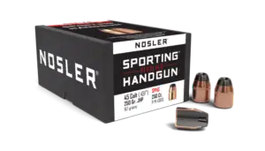 .45 COLT 250 GRAIN Nosler JHP Sporting Handgun- The .45 Colt cartridge, which is sometimes called .45 Long Colt, .45 LC, is a handgun cartridge dating to 1872. It was originally a black-powder revolver round developed for the Colt Single Action Army revolver. This cartridge was adopted by the U.S. Army in 1873 and served as an official US military handgun cartridge for 14 years. While it is sometimes referred to as .45 Long Colt or .45 LC, to differentiate it from the very popular and ubiquitous .45 ACP, and historically, the shorter .45 S&W Schofield, it was only an unofficial designation by Army quartermasters. Current catalog listings of compatible handguns list the caliber as .45 LC and .45 Colt.